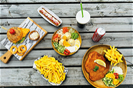 Friet, pikant gekruide kippendij en filet met paprika, rode ui, jalapeño en een bakje kerriesaus.