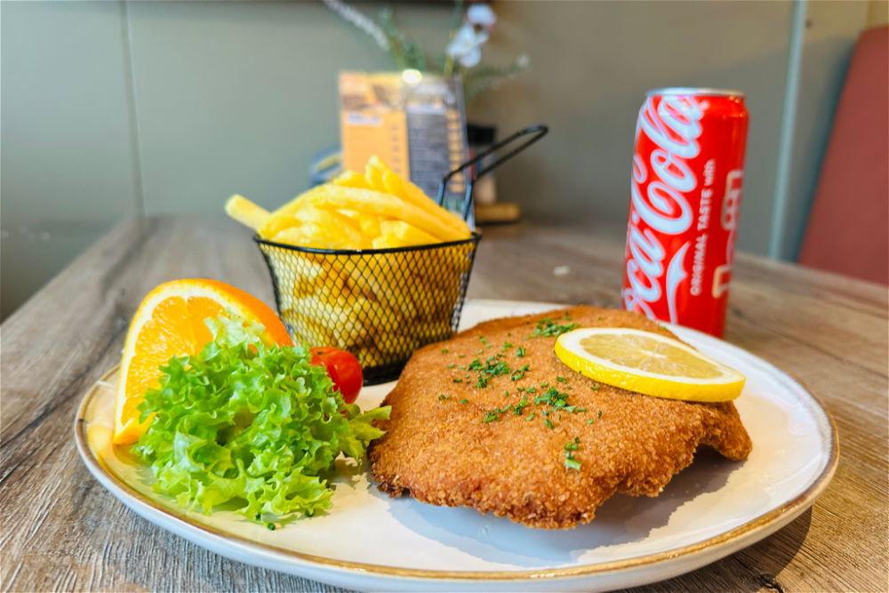 250 grams varkensschnitzel met gebakken spekjes, gebakken eitje, champignons, paprika en uitjes.